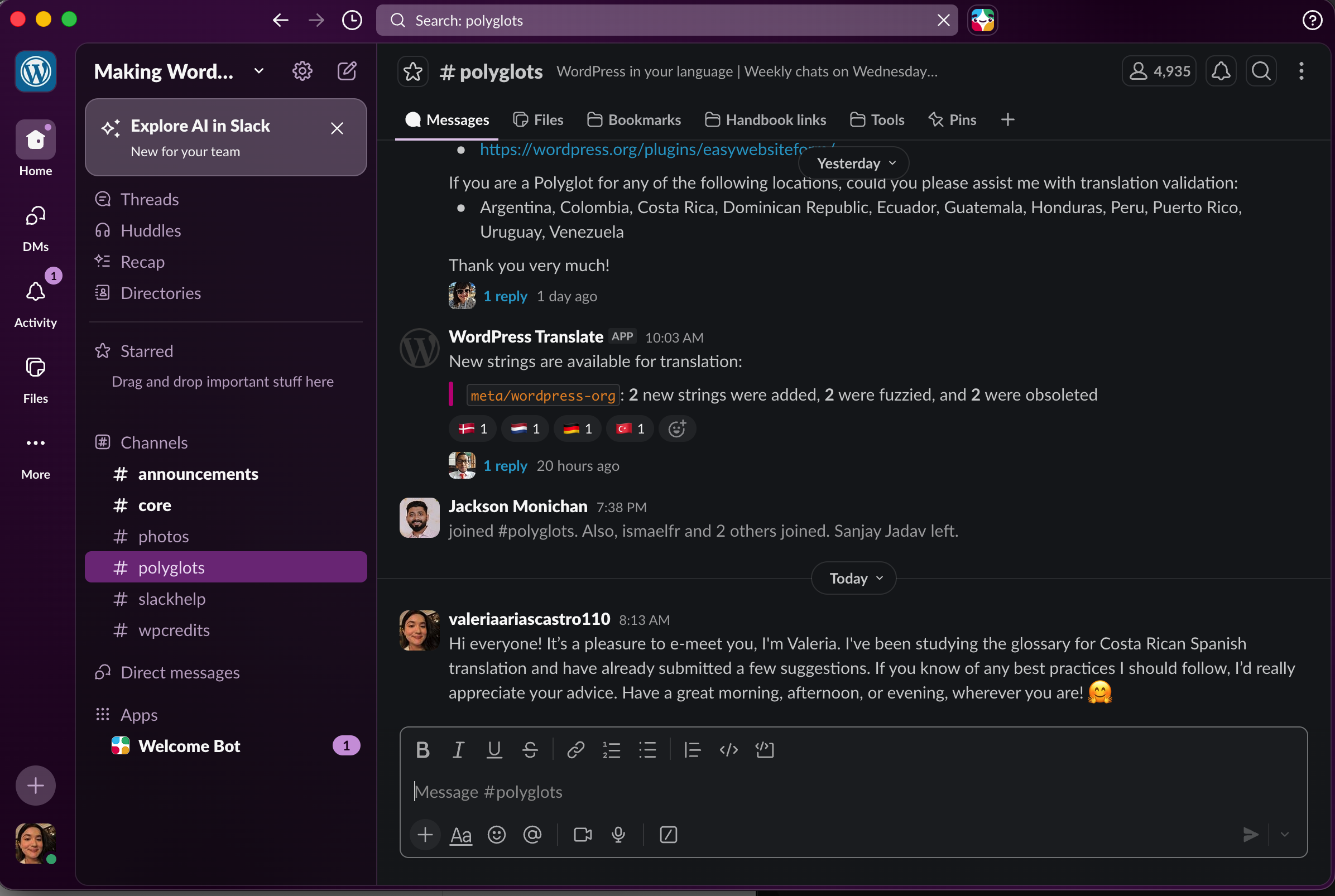 Para cumplir con los estándares de gestión del programa WordPress Credits, he interactuado con la comunidad global a través del Slack oficial de Make WordPress.